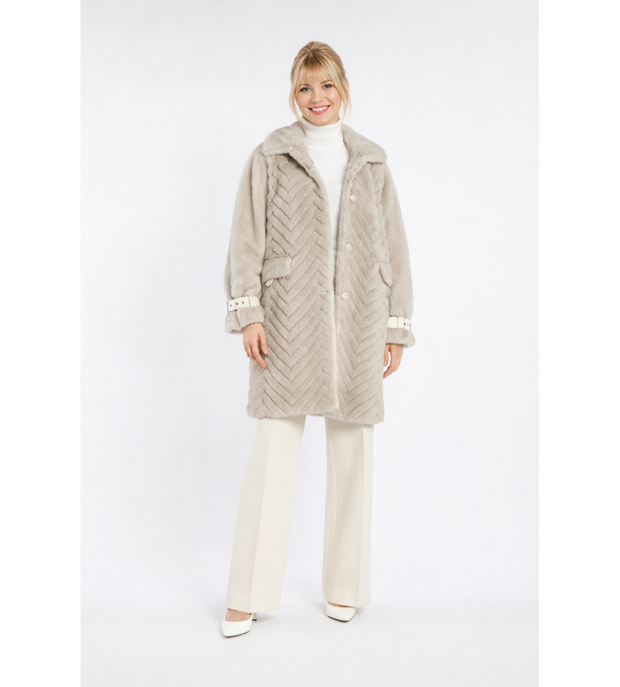 Dieser elegante Mantel ist aus weichem, geschorenem Kunstfell gefertigt, das natürliches Fell perfekt imitiert.