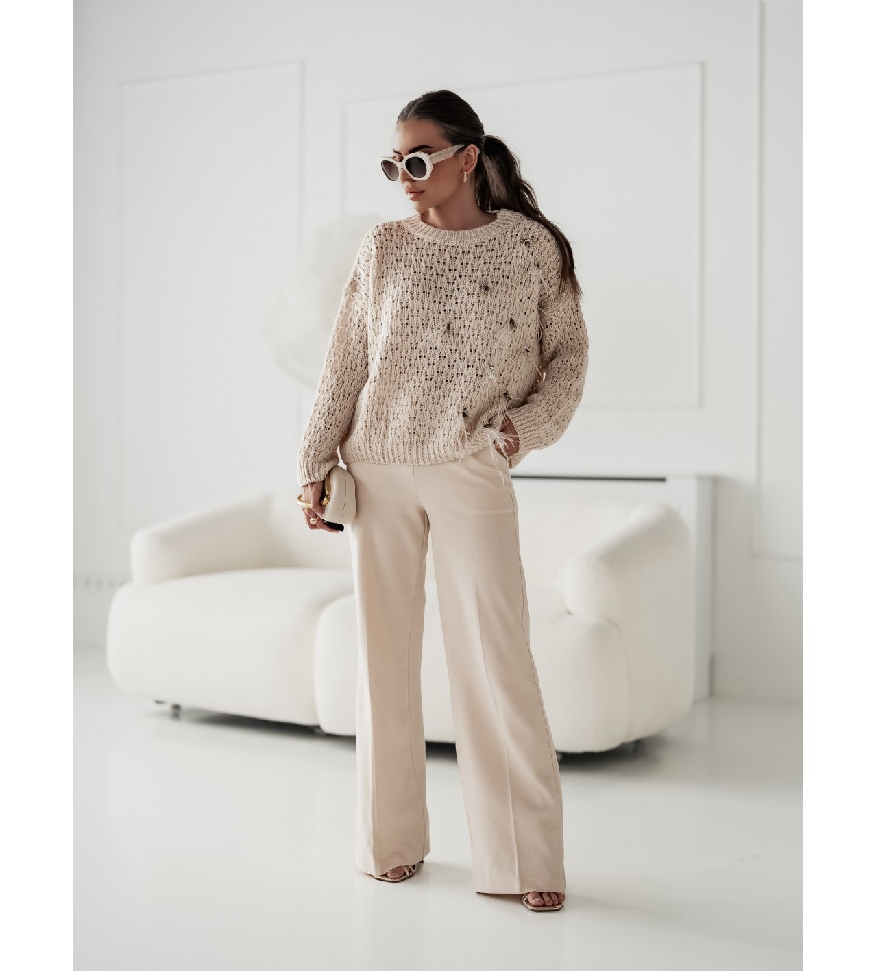 Dieser Mantel passt perfekt zu eleganten Outfits und lässt sich gut mit weißen Hosen, Shorts oder Röcken kombinieren. Er kann auch Teil eines Alltagsoutfits mit weißen Jeans sein.