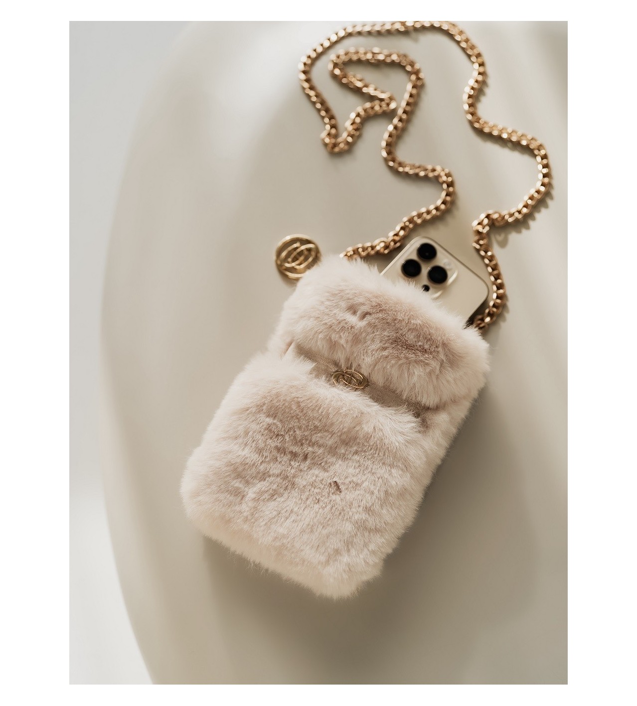 Fabriquée en fourrure synthétique douce de couleur crème. Il s'agit d'un sac à main souple pouvant contenir un téléphone portable, voire des cartes de crédit et des clés.